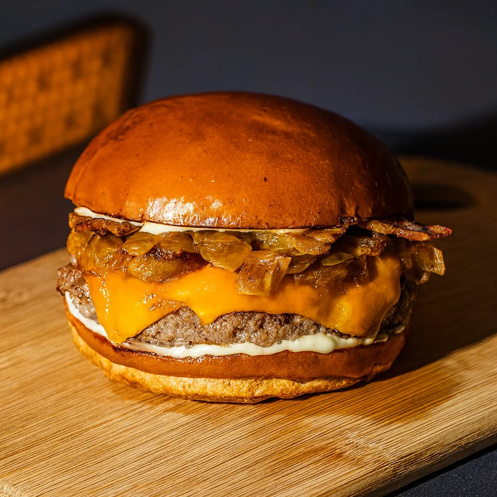Pão Brioche, Hambúrguer Duplo Smash 140g, Queijo Cheddar, Cebola Caramelizada, Bacon, Maionese, e Molho da Casa