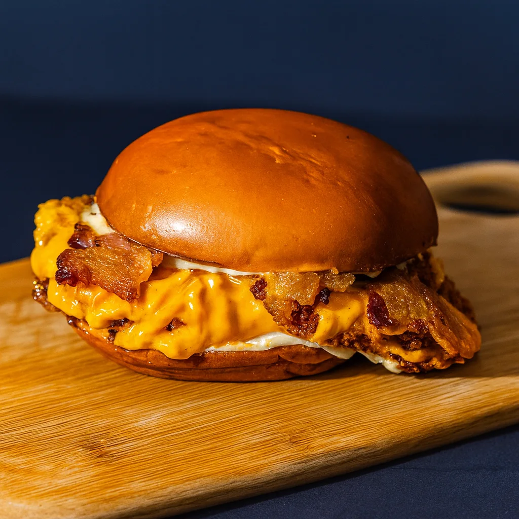 Sobrecoxa Marinada por 48h, Empanada com aquela casquinha crocante que faz crec na primeira mordida. Daí vem o Cheddar Cremoso Escorrendo, o Bacon Crocante quebrando tudo e a Maionese da Casa e Molho Especial segurando a emoção.