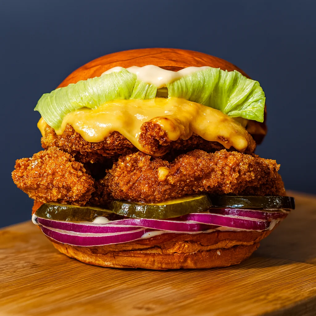 Sobrecoxa de Frango Marinada por 48h (só pra garantir o tempero que entra com respeito), Empanada na crocância certa, 2x Queijo Prato Derretendo, Alface Americana Fresquinha, Cebola Poxa, Nada daquele picles forte de mercado! Aqui é Picles Artesanal Agridoce e dois molhos que se completam melhor que casal de novela: Maionese e molho da Casa.