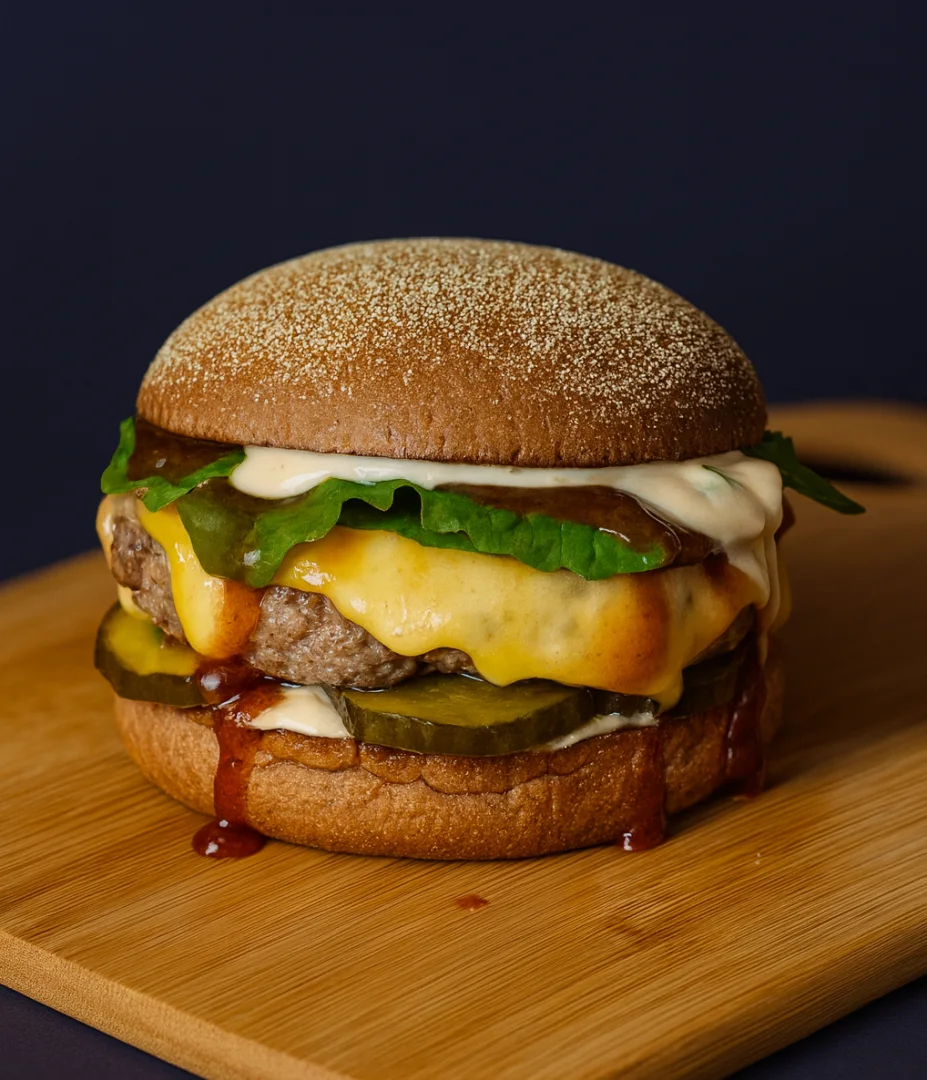 Sabe aquele lanche famoso? Esse é a versão com mais carne, mais queijo, mais picles e mais vontade de repetir. Pão Brioche Selado Leve e Macio, Hambúrguer de Carne 100% Angus (2 smash’s 70g/150g/180g), Cheddar Derretido, Alface Americana Julienne Crocante, Cebola Picadinha. Nada daquele picles forte de mercado! Aqui é Picles Artesanal Agridoce, Maionese e Molho Especial da Casa. O Méqui que vale a pena.